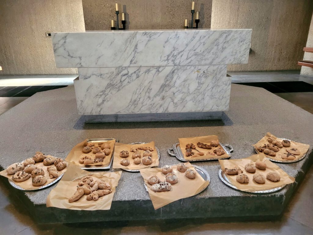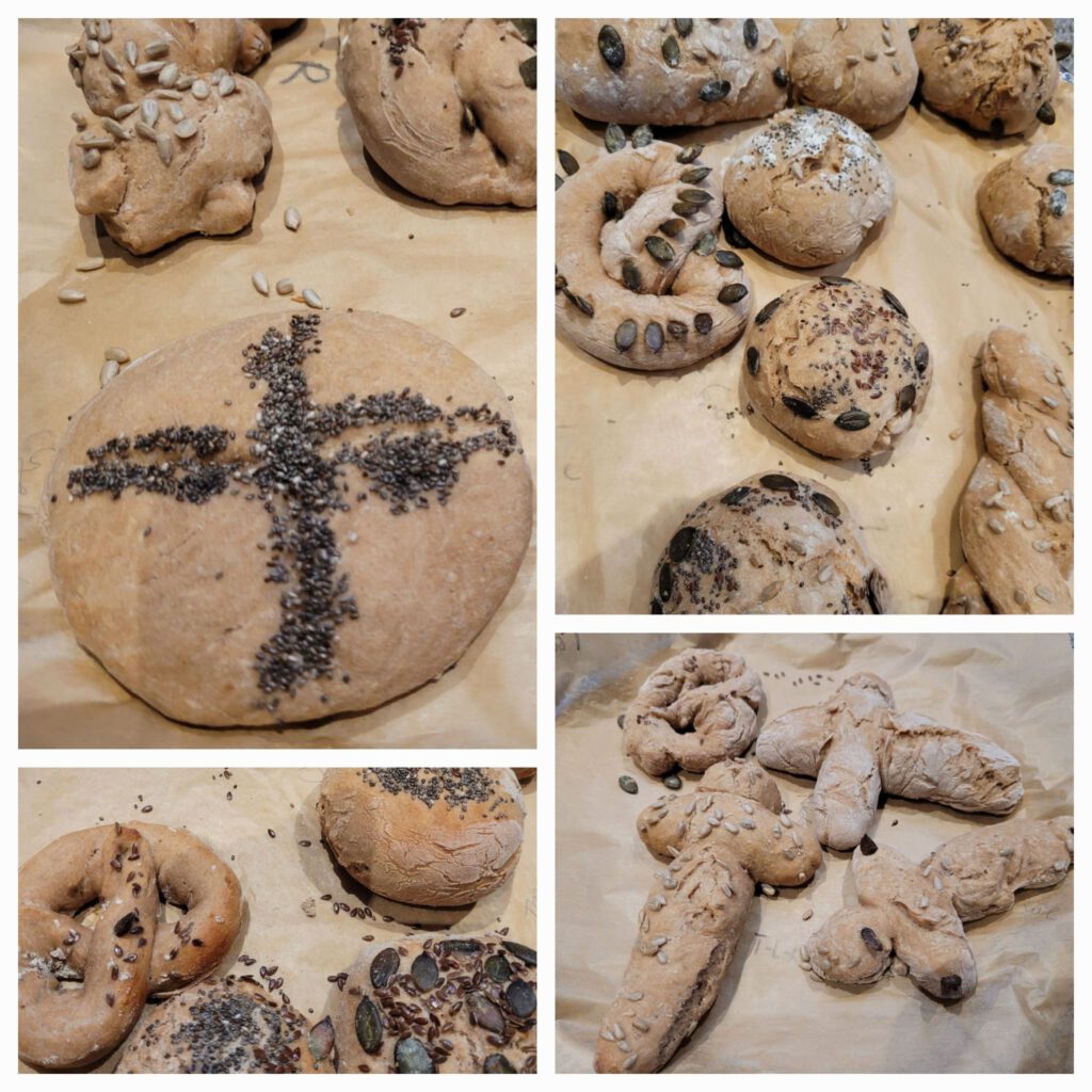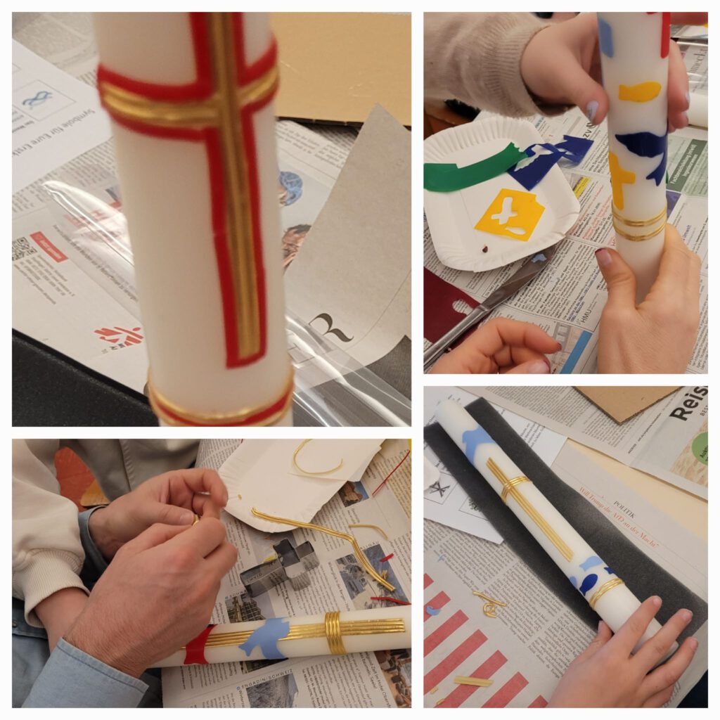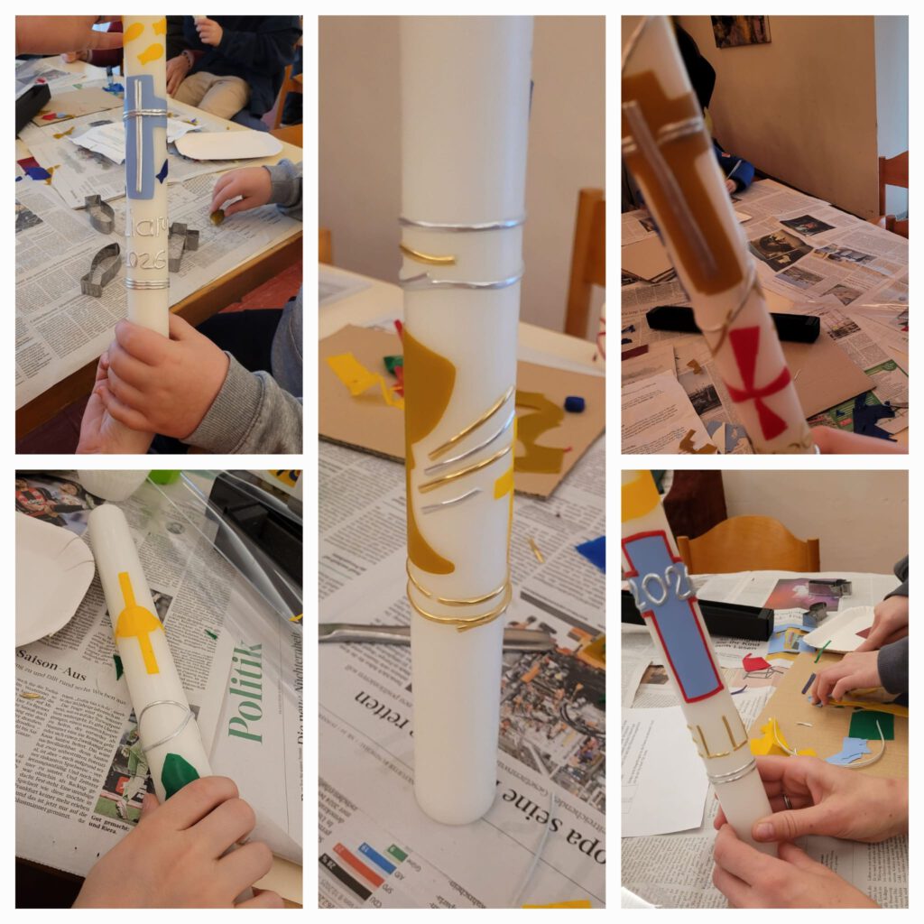 Unter dem verhüllten Kreuz und unseren schönen Kirchenfenstern war es eine behütete Nacht. Nach dem Frühstück am nächsten Morgen wechselten die Kinder in 4 Arbeitsgruppen zu den Themen: Ablauf eines Gottesdienstes, ein Brettspiel zum Thema, christliche Symbole und Brot backen. Der Abschluss war eine kurze Agape Feier. Kreativ wurden die Kinder gemeinsam mit ihren Eltern danach beim Verzieren ihrer Erstkommunionkerzen.