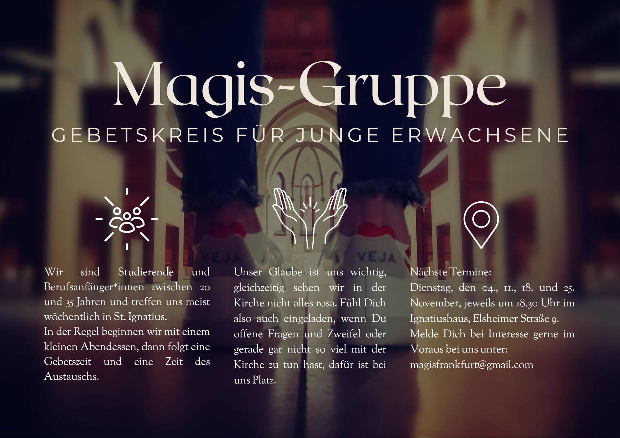 Die Treffen der Magis-Gruppe sind dienstags um 18.30 Uhr im Ignatiushaus der Jesuiten, Elsheimerstr.9